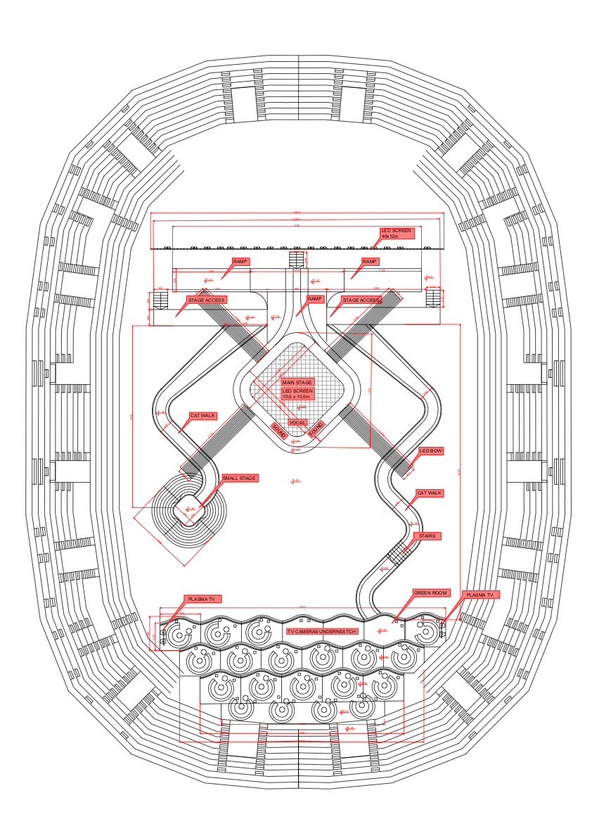 A résztvevő 19 versenyzője igazi világsztárnak érezheti magát, az idei Junior Eurovíziós Dalfesztivál színpadát szélein két kifutó is szegélyezi: az egyik az úgynevezett szatelitszínpadhoz , a másik pedig az aréna hátsó részében felépített Green Roomba vezet, egyfajta LED-es szalagként.